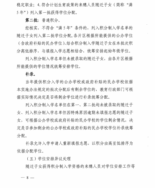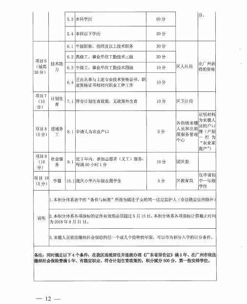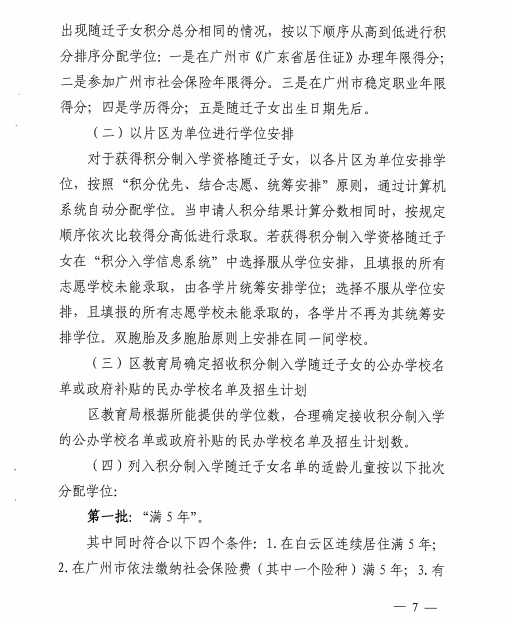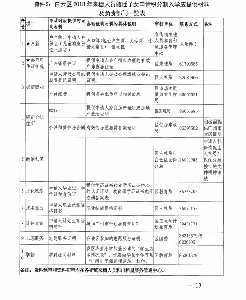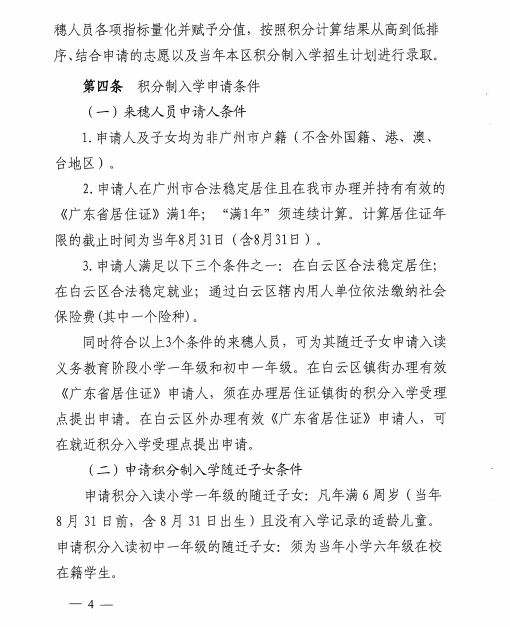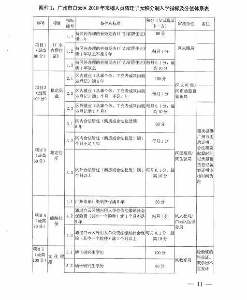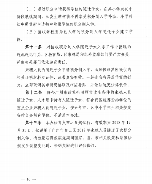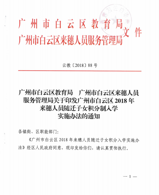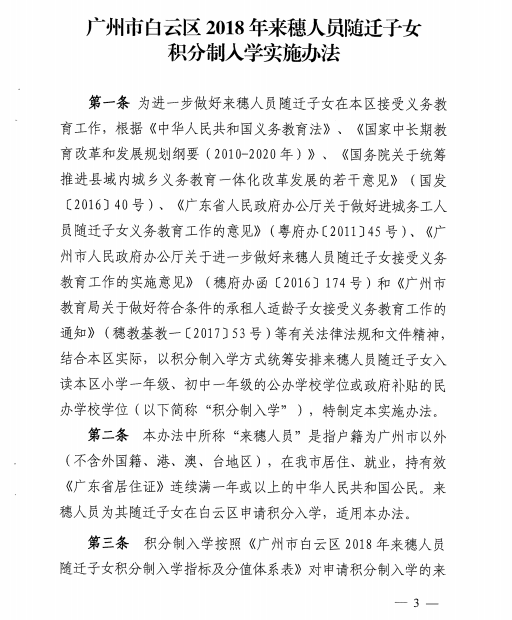 《广州市白云区2018年来穗人员随迁子女积分制入学实施办法》