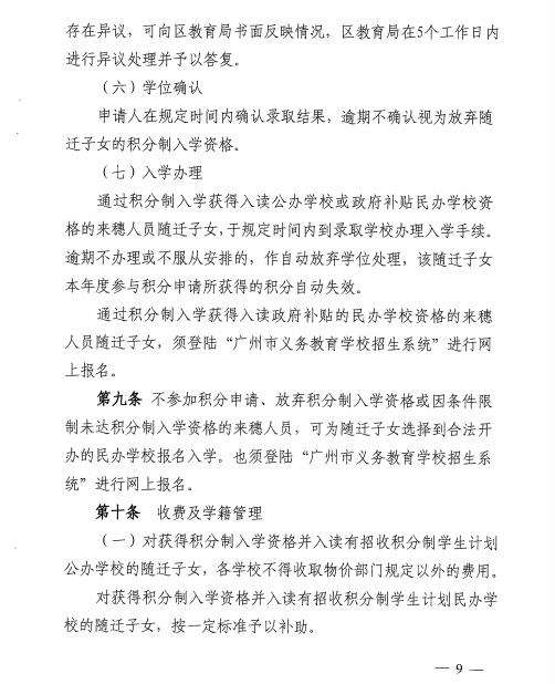 17 | 5.21-5.23(暂定) | 通过积分制入学获得入读政府补贴的民办学校资格的来穗人员随迁子女登陆“广州市义务教育学校招生系统”进行网上报名。 | 区教育局 | 根据市教育局时间安排再定 |